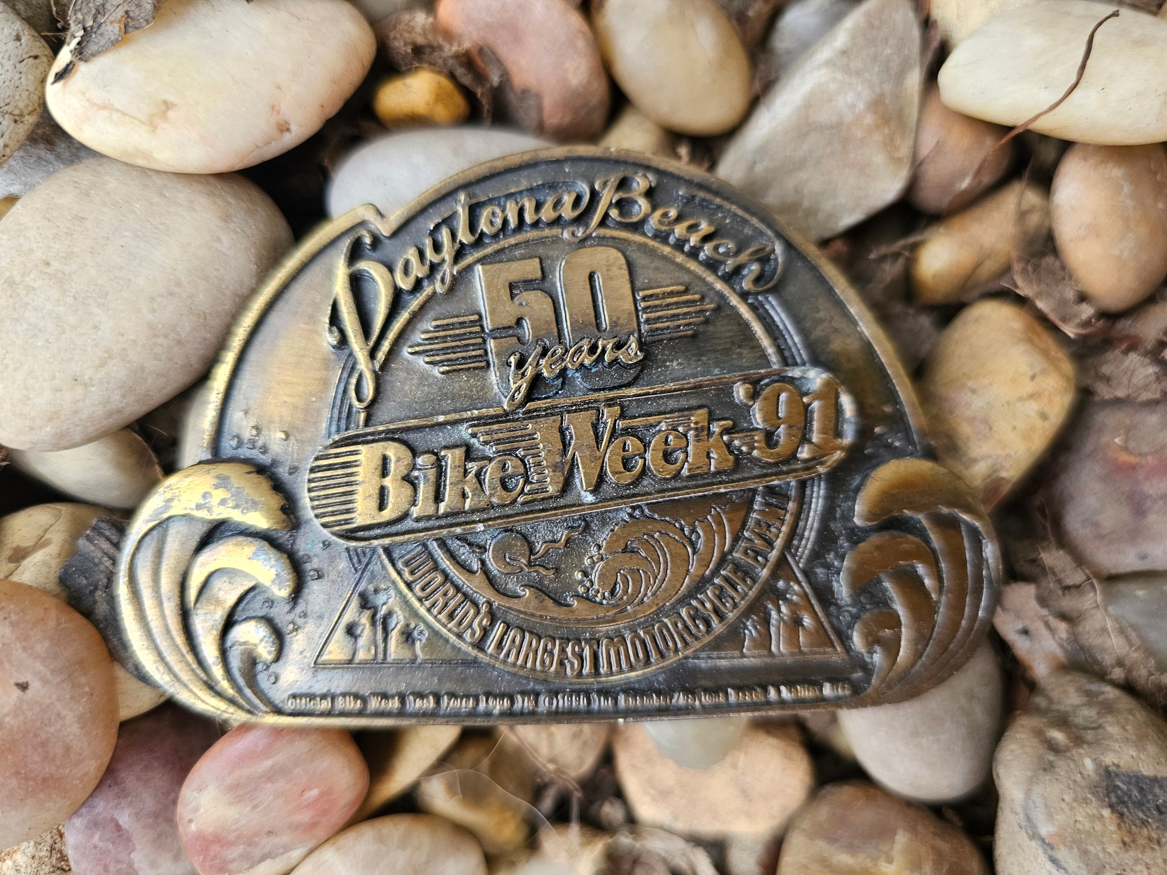 Vintage belt buckle with semi trucks and Peterbilt logo. Buckle is numbered