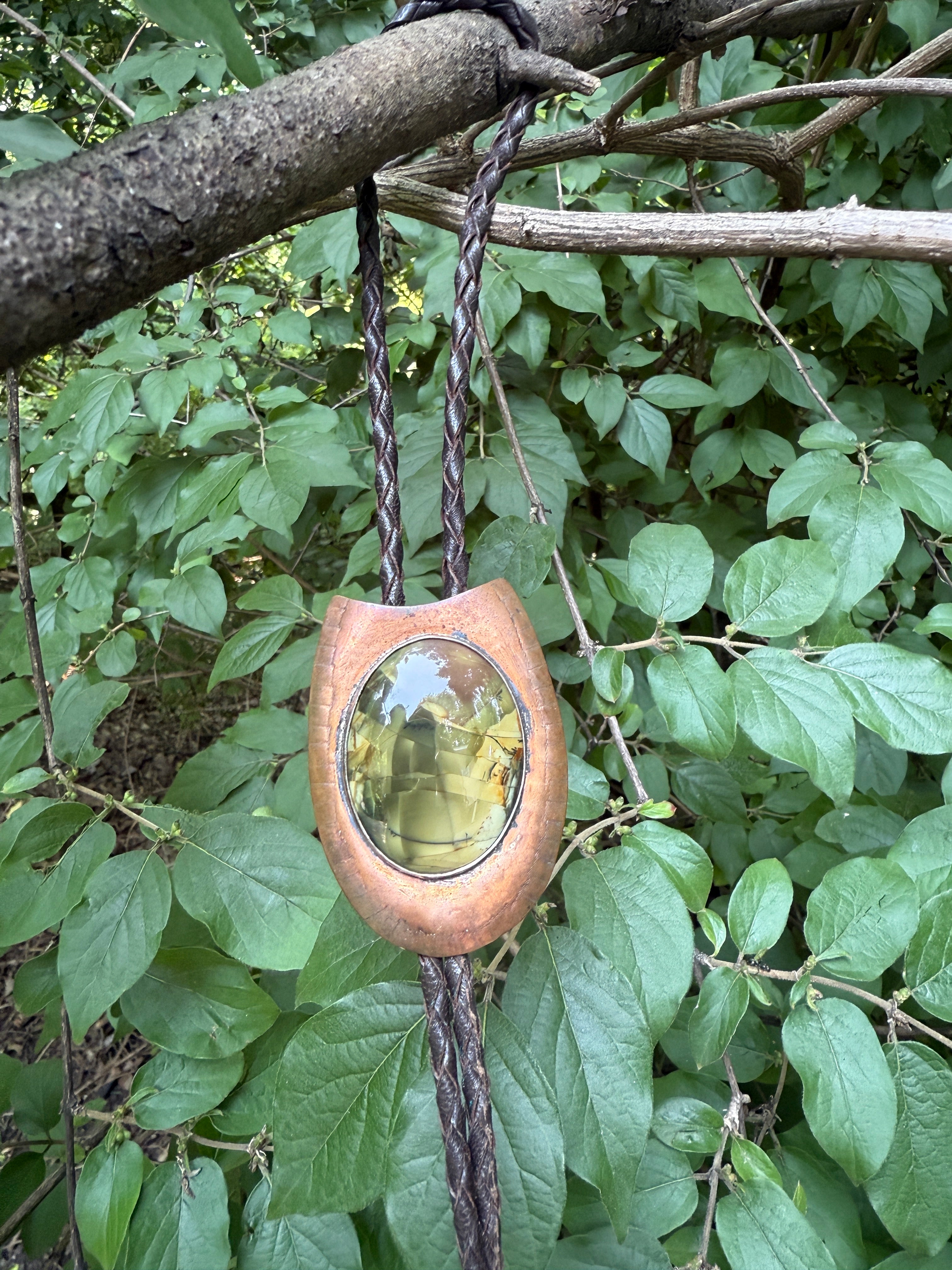 80s rope style; Buckle is round and appears to be Cloissoné with green gold brown leaves. Hook style closure.
